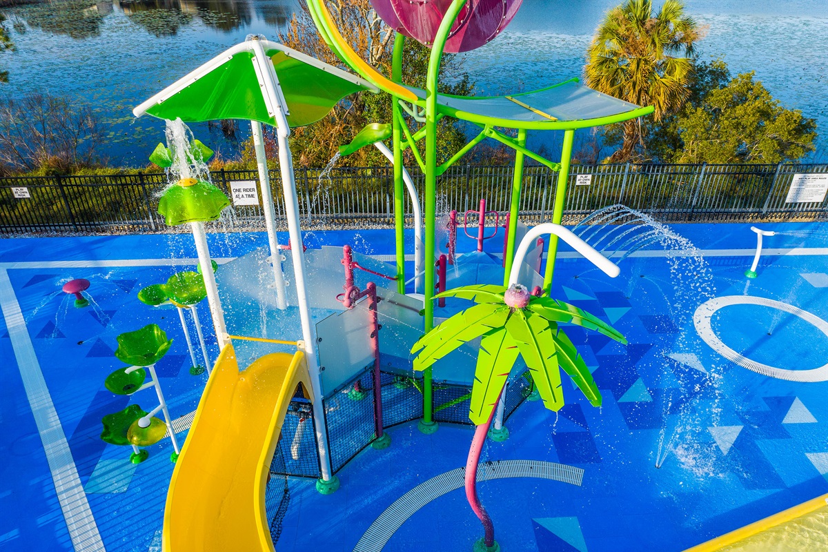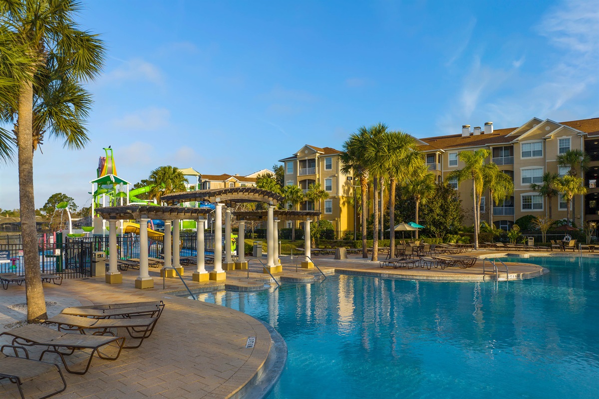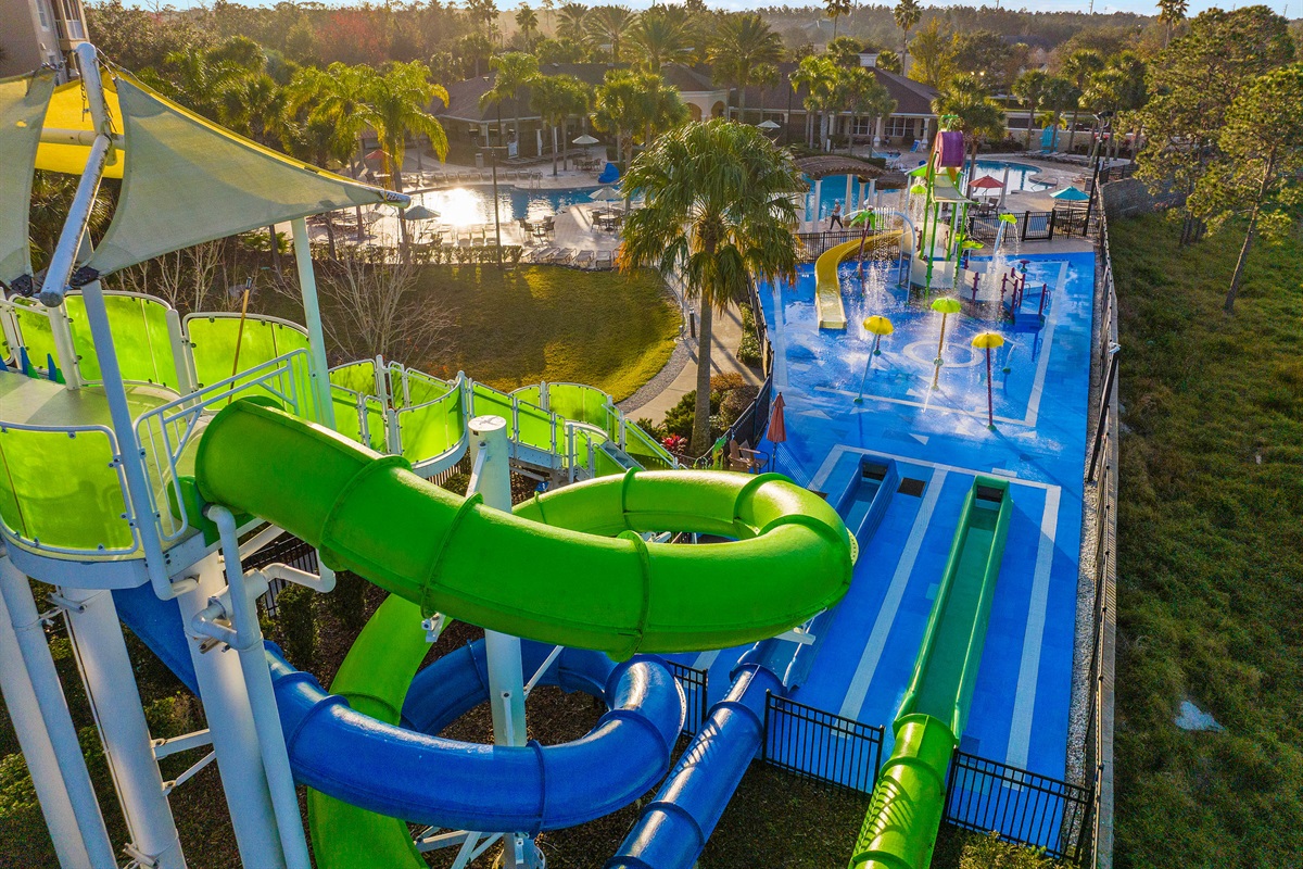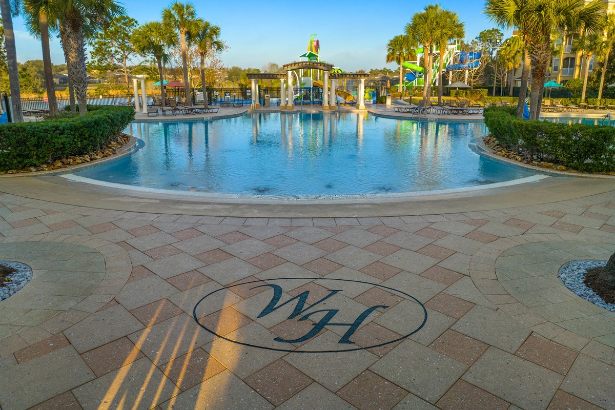 Lagoon-style community pool with Aqua Water Park and dueling slides