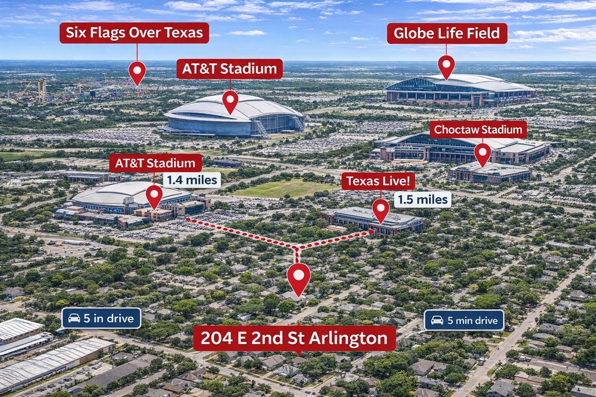 2 Bedrooms • 1 Bathroom 1 Bath • Sleeps 4-6Stay in a charming historic Arlington landmark just 5 minutes from AT&T Stadium and Globe Life Field. Walk to downtown cafés, restaurants, and parks, then return to a cozy 2-bedroom retreat with fast WiFi, Smart TVs, free parking, and easy self check-in. Perfect for Cowboys games, Rangers games, concerts, UTA visits, and family trips to DFW.