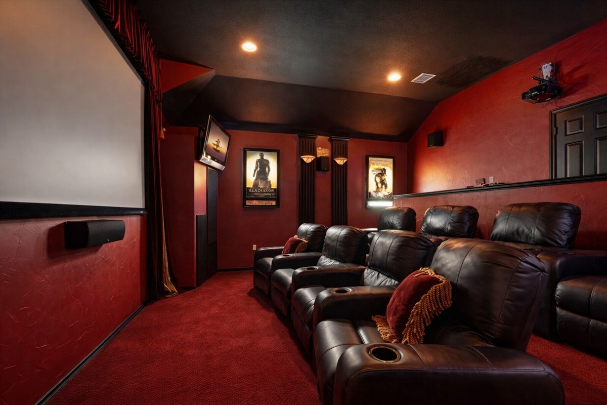 Upstairs, the experience continues with a dedicated cinema-style theater room and a separate entertainment lounge, creating distinct spaces for relaxation and fun.