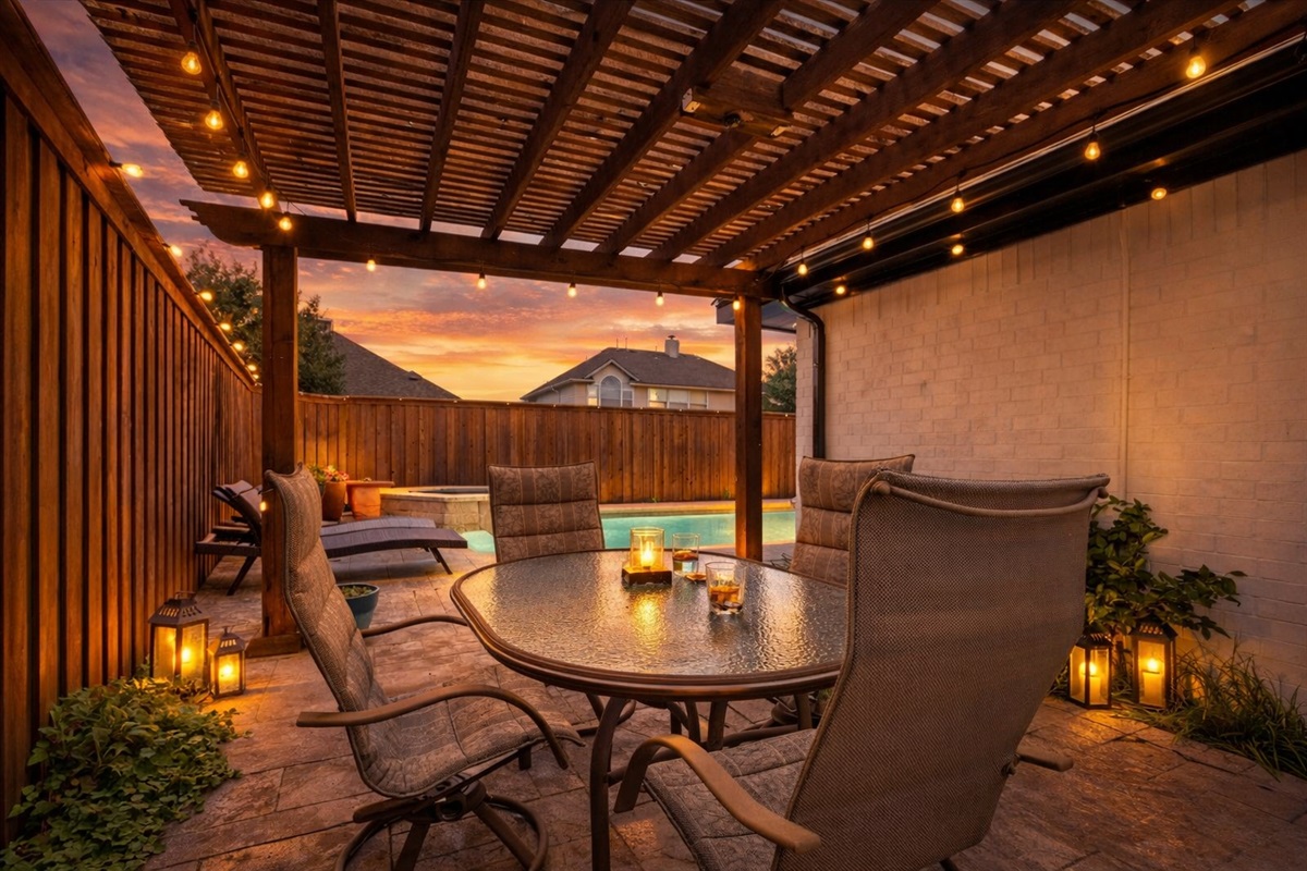 Out back, your private pool and spa create a true Texas backyard oasis — ideal for sunny afternoons and evening gatherings under soft string lights.